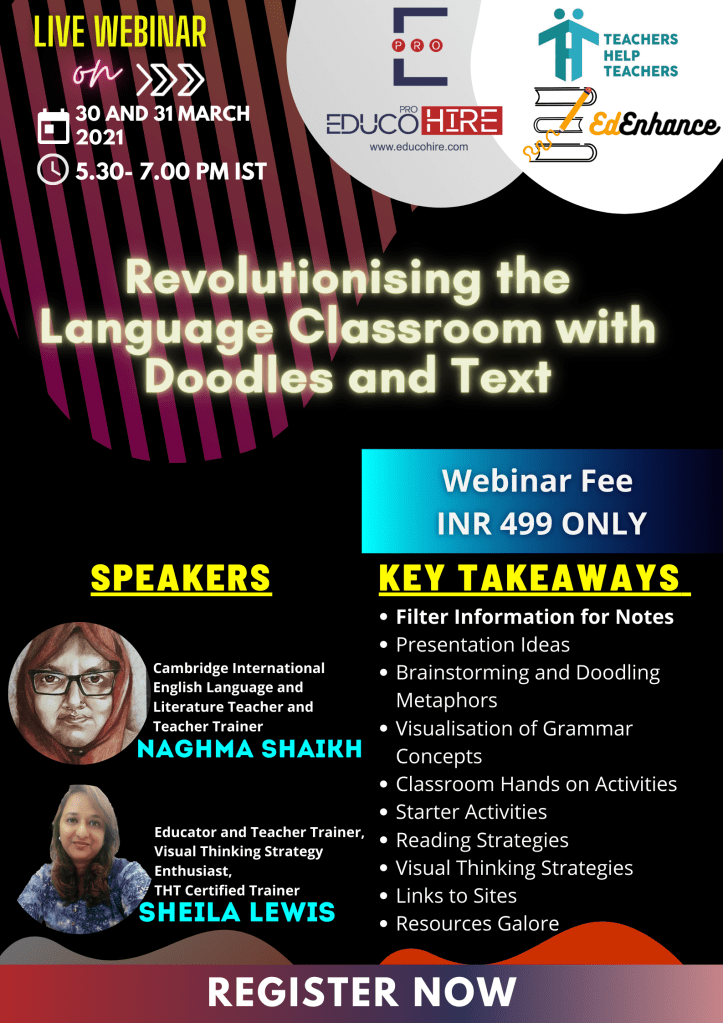 It was indeed an honour collaborating with Ms Naghma Shaikh for the Language Classroom- Doodle for Education Session on 30, 31 March 2021. From deep insights to a number of strategies with purposeful doodling that can revolutionise the Language Classroom, turned into a fun learning experience. Hats off to Ms Naghma Shaikh‘s efforts and motivation, we rocked it again with EdEnhance Edu Skill Enhancer .Thank you Rakhee Chhabria for your constant support for educators! #TeachersHelpTeachersThank you Educohire for your team and support!