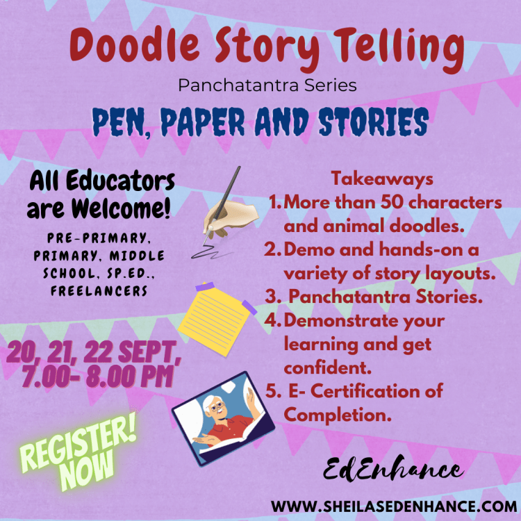 This includes practicing animal doodles( faces, bodies and expressions), story templates to facilitate Story Telling with doodles and culmination with participants practically demonstrating their story.