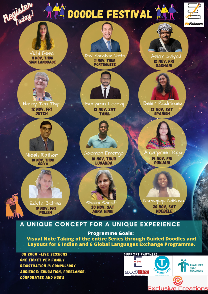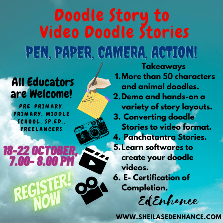 Further, educators will be able to convert these doodles into a doodle video story and create their own doodle videos on two softwares that we will learn and create together.